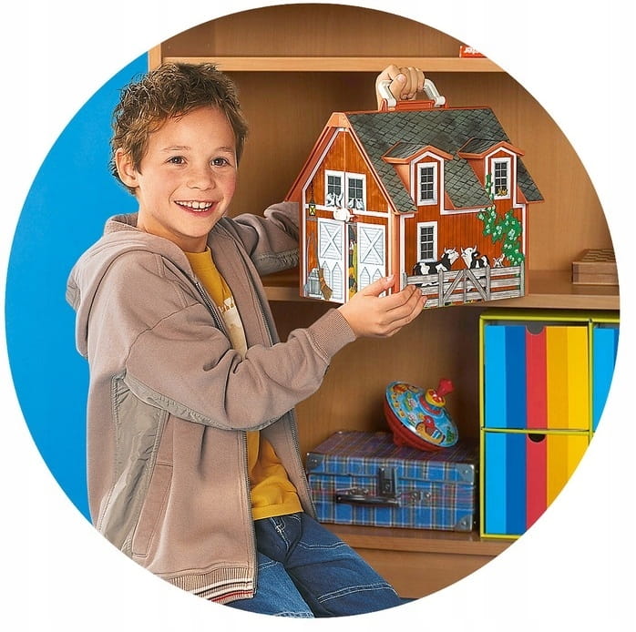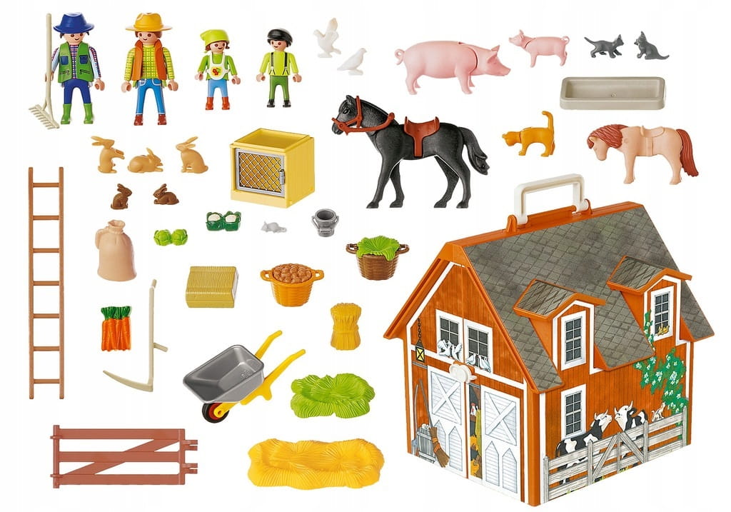 W zestawie dzieci znajdą mnóstwo akcesoriów takich jak zwierzęta gospodarskie i domowe, sprzęty na co dzień używane do pracy na farmie, zagrody czy klatki dla zwierząt, pasze czy plony zebrane przez gospodarzy.