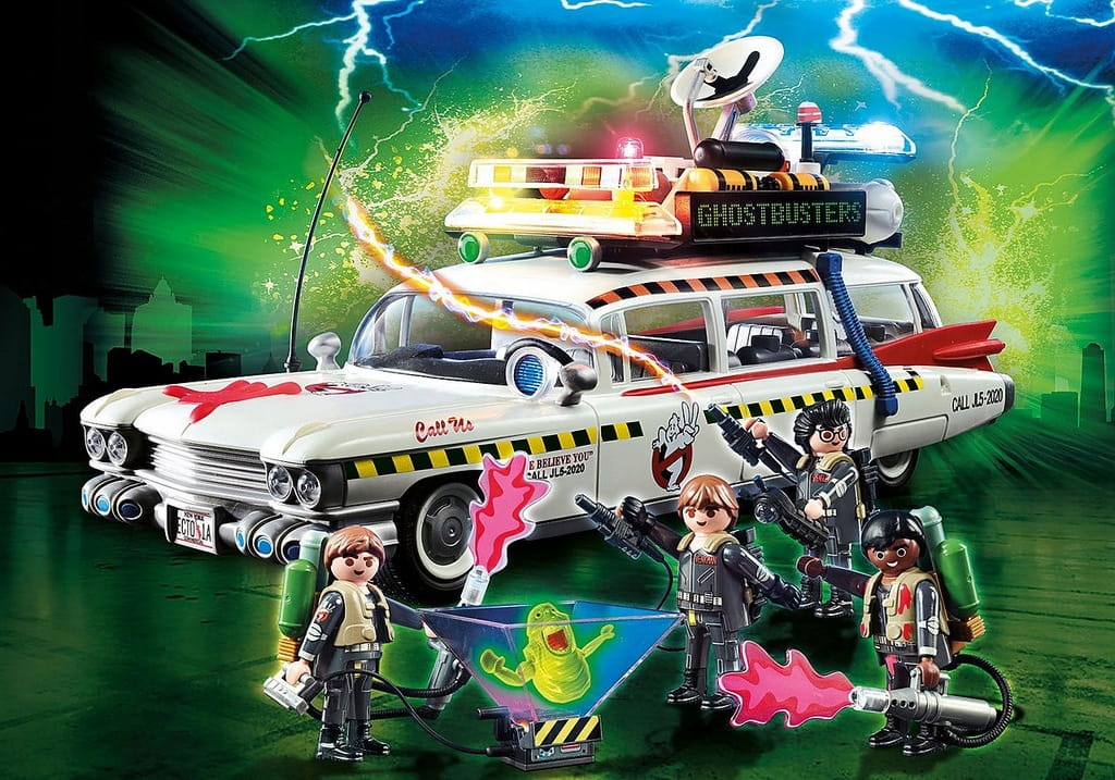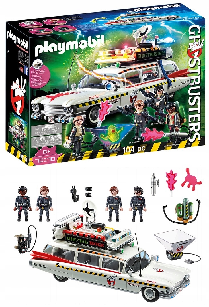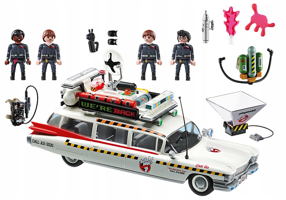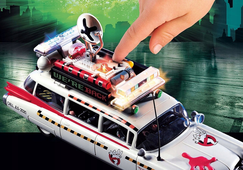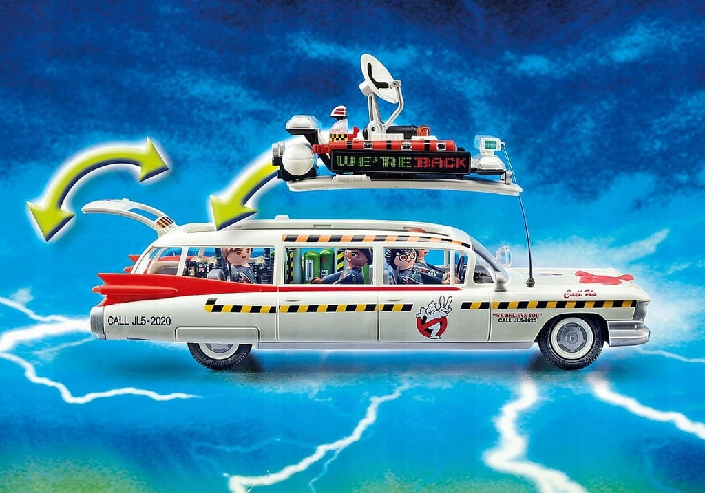 PLAYMOBIL Pogromcy Duchów Ecto-1A - to niezwykły pojazd z konstrukcją dachu z drugiego filmu Ghostbusters. Zestaw zawiera cztery figurki i playmogram. W pojeździe znajduje się miejsce dla czterech figurek pogromców duchów, dla ich protonowych plecaków, pułapki na duchy oraz dla innego sprzętu, a za pomocą dwóch niezależnych przycisków modułu, na dachu pojazdu można włączyć oryginalny dźwięk syreny oraz efekty świetlne.