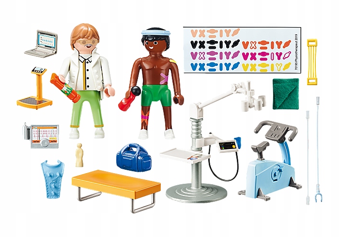 Fizjoterapeuta 70195 to wspaniały komplet uzupełniający budynek szpitala 70190 (sprzedawany oddzielnie) lub niezależny zestaw do zabawy figurkami i akcesoriami Playmobil. Przyspiesz regenerację dzięki wizytom u fizjoterapeuty. Gabinet jest pełen sprzętu, który pomaga pacjentowi odzyskać siły, równowagę i elastyczność. Skorzystaj z roweru stacjonarnego i maszyny EKG, aby monitorować parametry witalne i stworzyć terapię fizykoterapeutyczną specjalnie dla swojego pacjenta. Zestaw zawiera dwie figurki, rower stacjonarny, maszynę EKG z monitorem, torbę sportową, ławkę, kartę medyczną i wiele innych akcesoriów tematycznych.