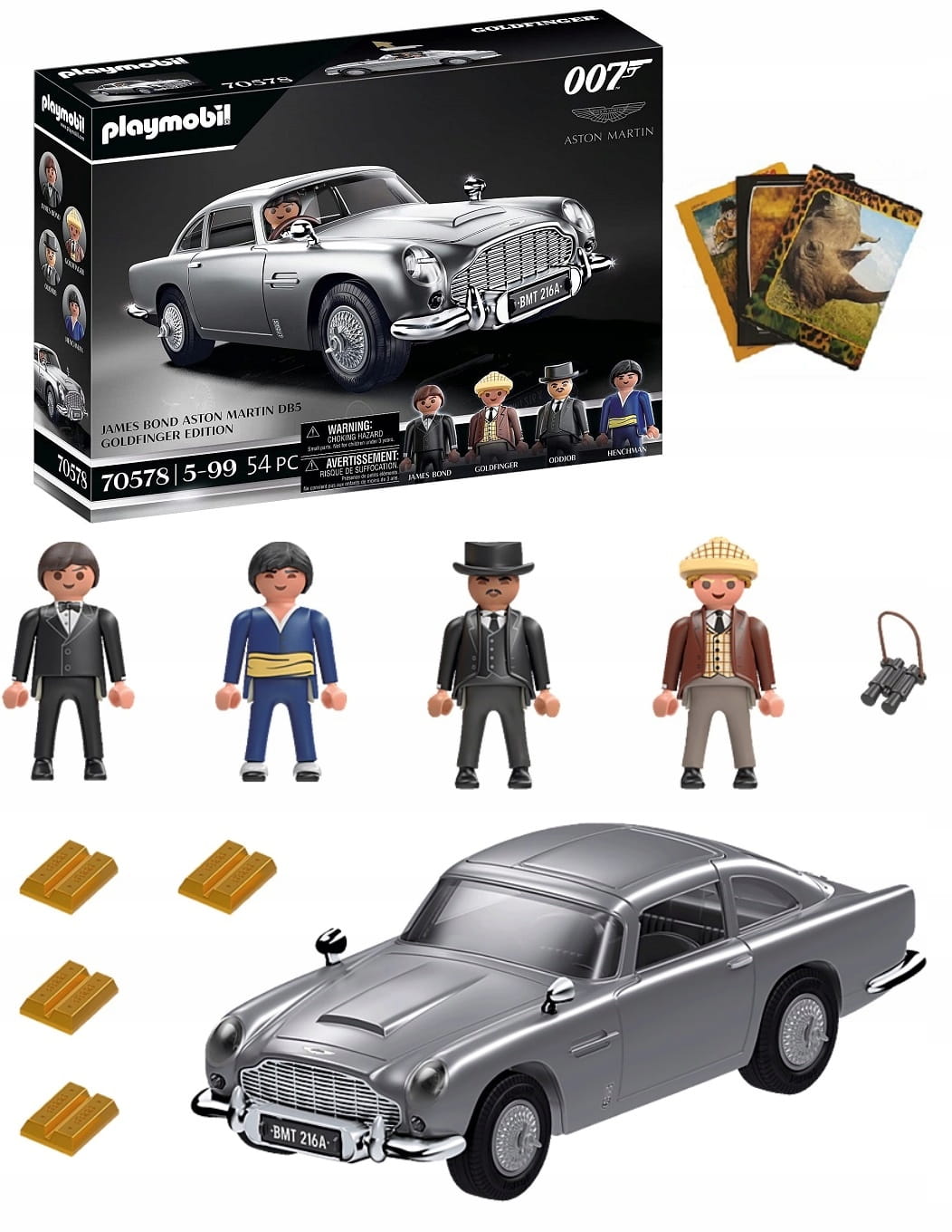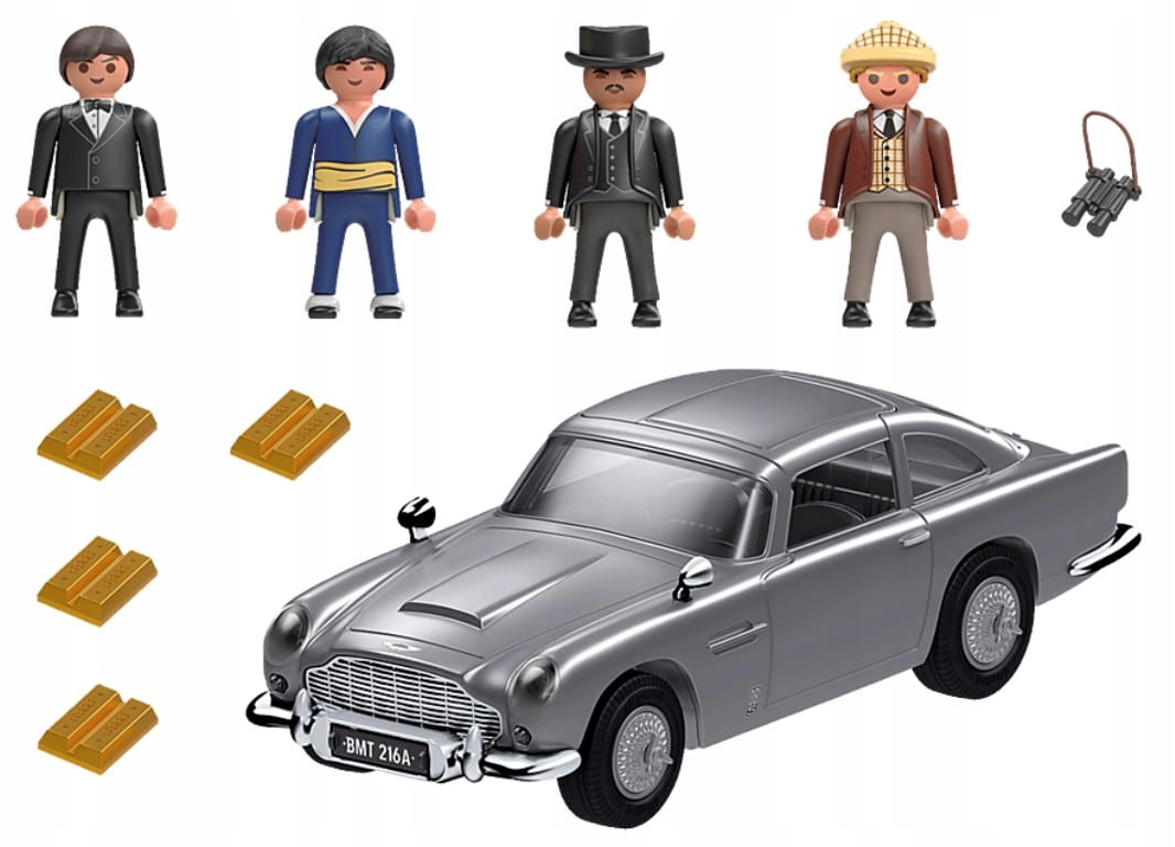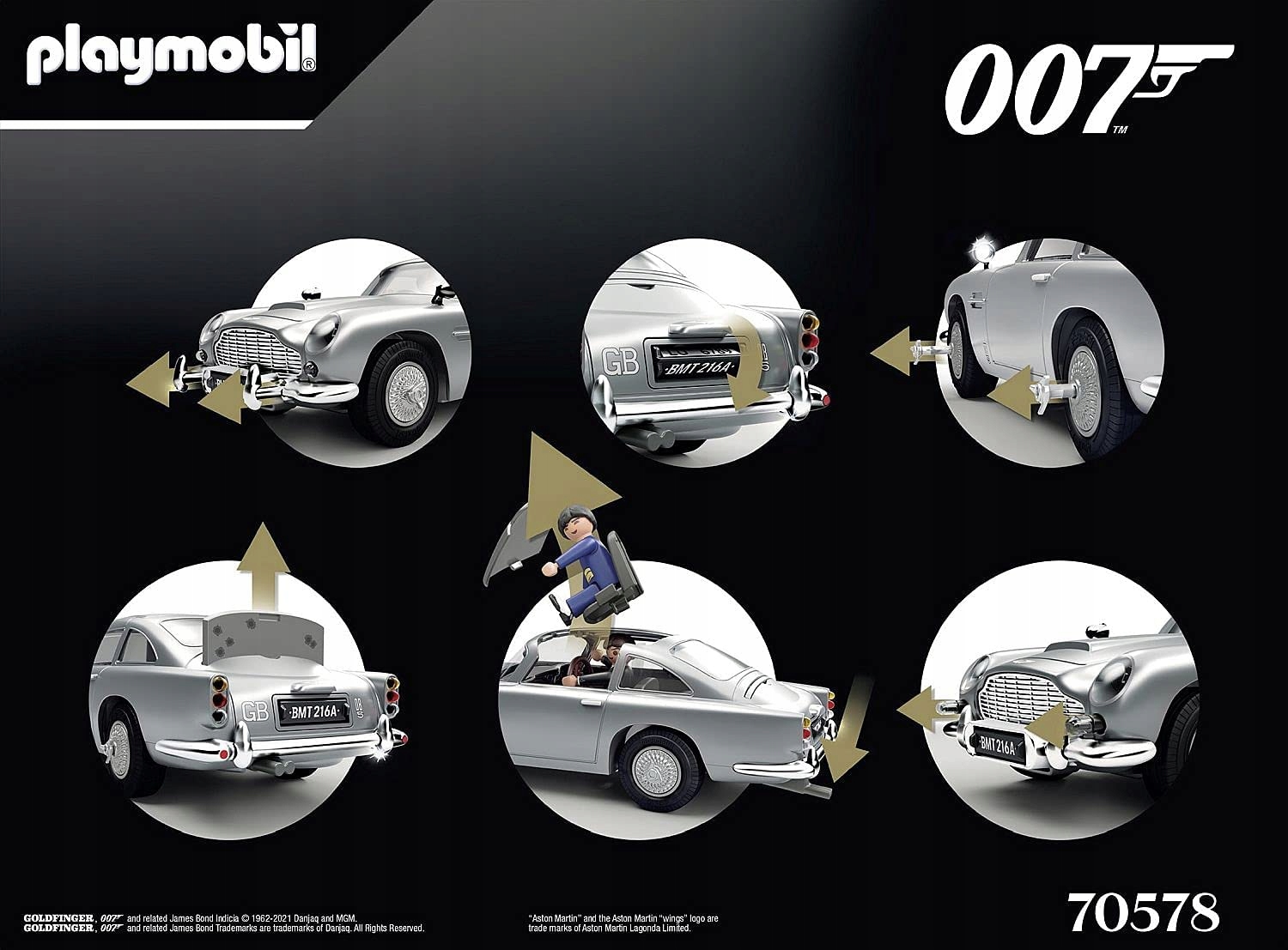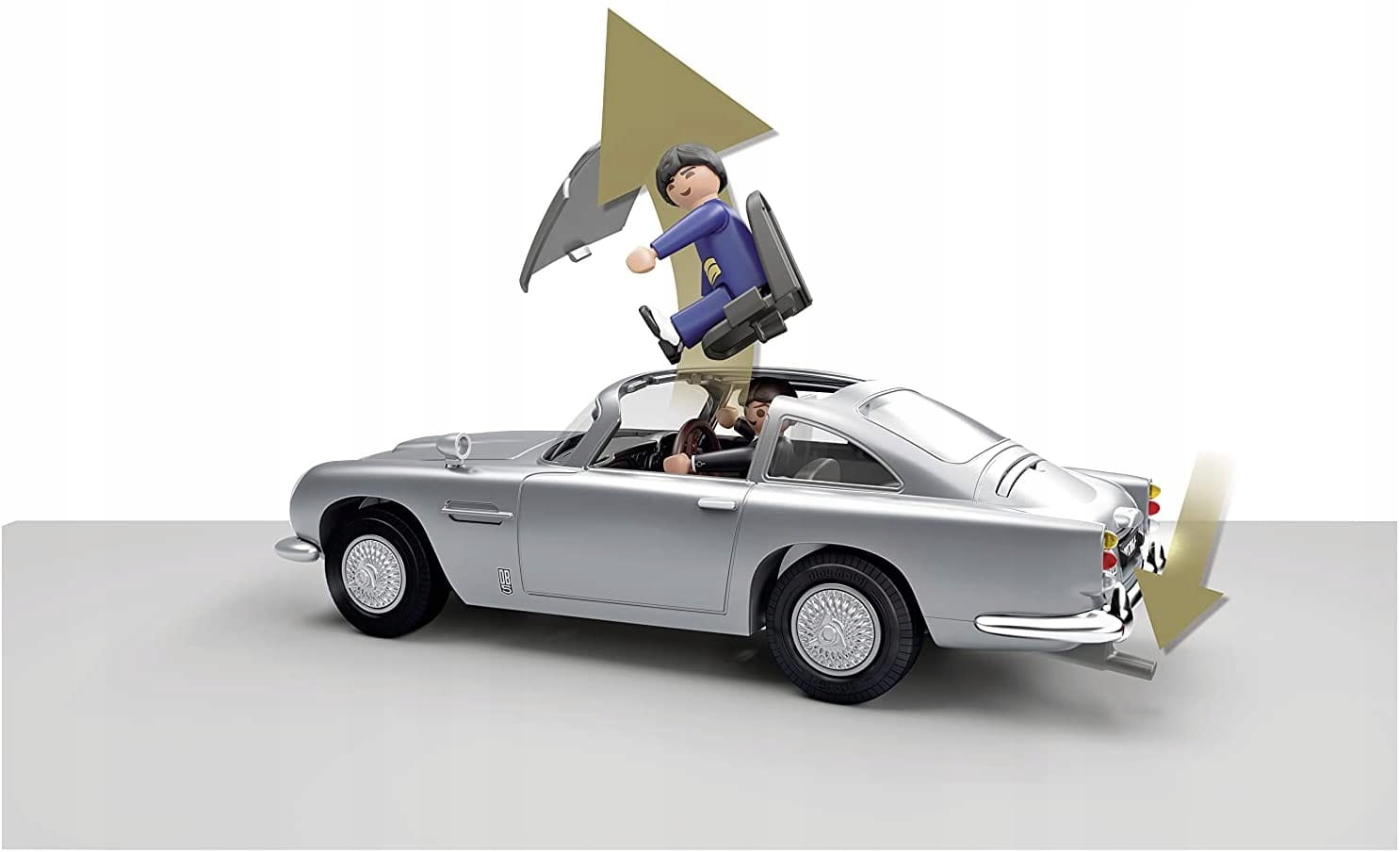 Już od prawie sześćdziesięciu lat przygody 007 zachwycają fanów na całym świecie. Każde nowe zlecenie to eksplozja akcji, wypełniona niebezpiecznymi scenami kaskaderskimi, zapierającymi dech w piersiach pościgami i oczywiście technicznym wyposażeniem szpiegowskim najnowszej generacji. W trzeciej ekranowej odsłonie filmu Goldfinger (1964) James Bond prowadzi po raz pierwszy legendarnego Astona Martina DB5. Ten srebrny samochód posiada oryginalne, specjalne dodatki takie jak: obrotowe tablice rejestracyjne i fotel katapultowy pasażera oraz wiele więcej. W tym ponadczasowym samochodzie podczas spektakularnych pościgów 007 zostawia wszystkich swoich prześladowców w tyle i ostatecznie krzyżuje plany przeciwnika Aurica Goldfingera. Nowy zestaw PLAYMOBIL to mus dla każdego fana przygód Jamesa Bonda!