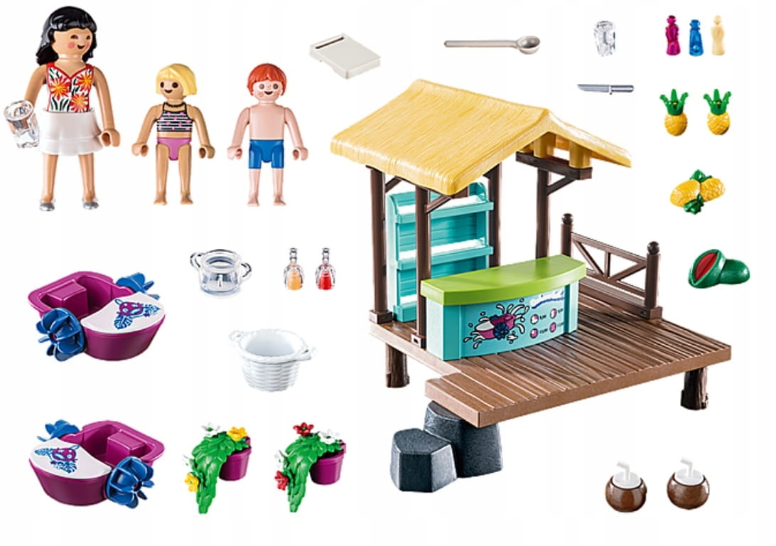 - Akcesoria: 1 batonik z sokami, 1 drewniany most, 1 kamień, 1 element ogrodzenia, 2 łodzie wiosłowe, 1 półka, 1 lada, 2 doniczki, 2 rośliny, 6 kwiatów, 1 deska do krojenia , 1 nóż, 1 drewniana łyżka , 1 miska na sok, 2 butelki na sok, 3 butelki, 5 szklanek, 1 kosz, 3 ananasy, 1 melon, 2 kokosy ze słomkami.