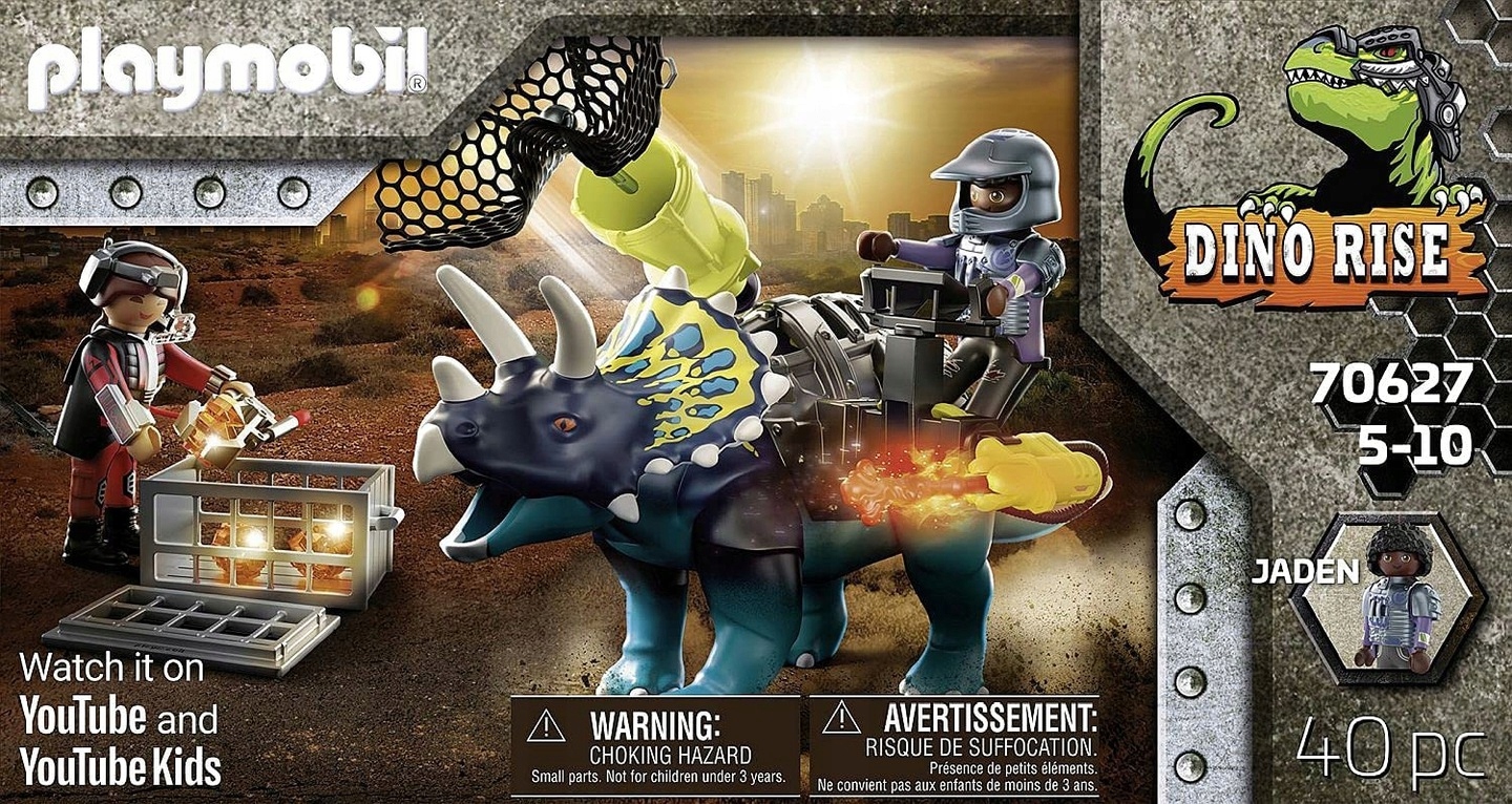 Wyposażony w działającą siatkową armatę bezpieczeństwa, zdejmowaną zbroję, Jaden może jeździć na Triceratopsach. Czasami wróg jest też znacznie mniejszy niż oczekiwano, na przykład mini robot. Paskudne małe maszyny niezauważone próbują odkryć plany wuja Roba i zespołu Dino. Ale zespołowi Dino nie jest łatwo zajrzeć do kart. Aby być przygotowanym na dużych i małych przeciwników, opancerzony Triceratops ma nie tylko zwykłe działo, ale także armatę z siatką bezpieczeństwa. Jeśli jego partner Jaden w odpowiednim momencie wyrzuci siatkę bezpieczeństwa, mini roboty również zostaną aresztowane, a tym samym unieruchomione. Silna moc dinozaurów do trudnych misji specjalnych!