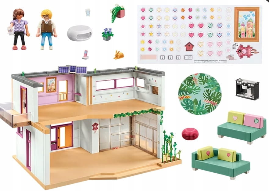 W dużym domu z ogrodem zimowym spełniają się wszystkie marzenia! Przestronny dom rodzinny w stylu Bauhaus oferuje mnóstwo miejsca do zabawy i indywidualnego umeblowania. Pokój dzienny jest centralnym pomieszczeniem dużego domu i jest już w pełni wyposażony. Dzięki dodatkowym zestawom można uzupełnić pozostałe pomieszczenia. Panele słoneczne na dachu zaopatrują w przyjazną dla środowiska energię. Dom można dowolnie uzupełniać i przebudowywać za pomocą czterech zestawów do wyposażenia pomieszczeń. Niektóre zestawy zawierają także naklejki umożliwiające indywidualne udekorowanie budynku i wyposażenia wnętrza.