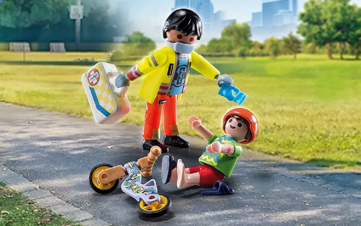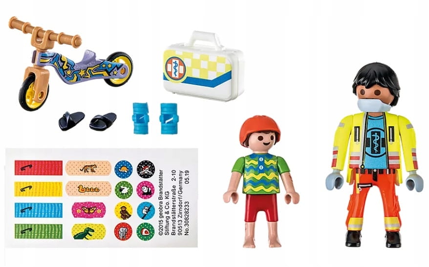 Zestaw zabawek dla dzieci od 4 lat zawiera dwie figurki PLAYMOBIL, hulajnogę, apteczkę, szyny pierwszej pomocy, kask i inne dodatki. Rany można opatrzyć dołączonymi plastrami. „Urazy” na ręce i nodze dziecka są zrobione farbą termoczułą, która znika po potarciu i staje się znów widoczna po ostygnięciu.