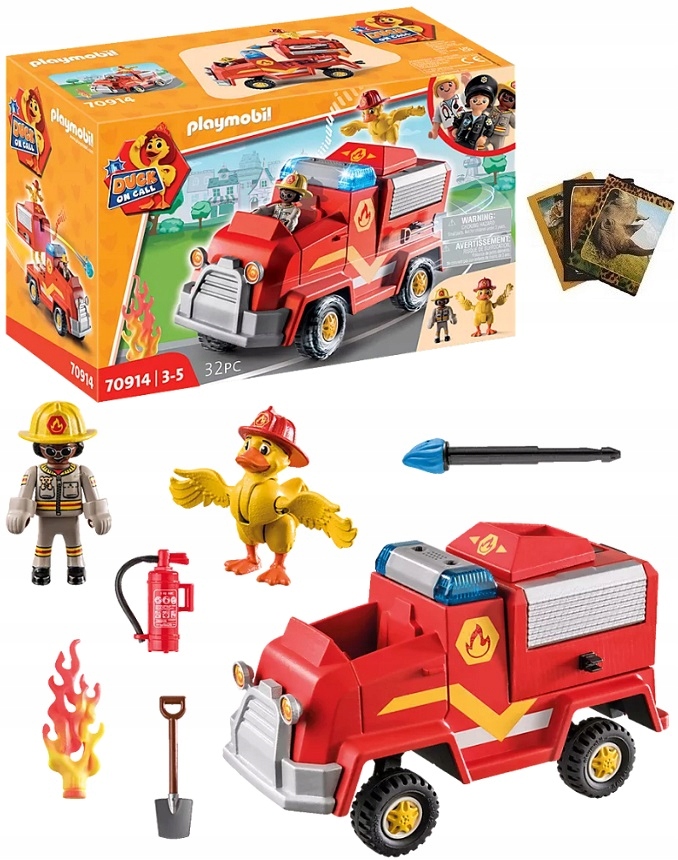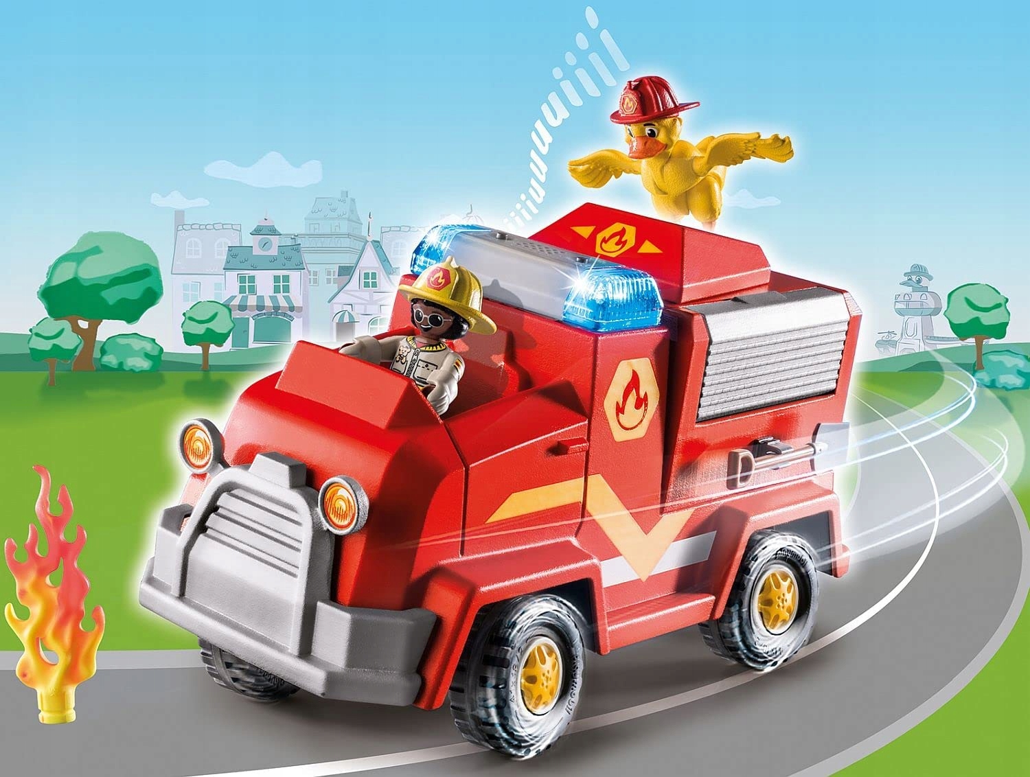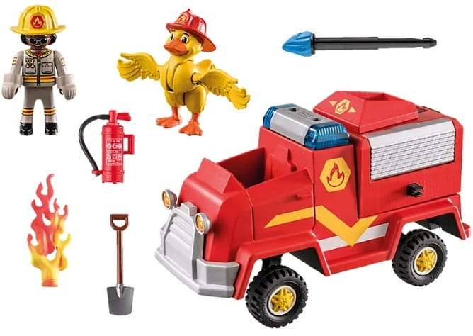 Zagrożenie! W Playmoville wybuchł pożar. Gdzie jest Freddy Fire ze swoim pojazdem strażackim? Oto on, szybko opanowując ogień za pomocą armatki wodnej i pomocy kaczek. Zestaw do zabawy składa się z dwóch figurek PLAYMOBIL oraz wozu strażackiego z innowacyjnym uchylnym układem kierowniczym, w tym podnoszonym koszem z armatką wodną i rzutkami wodnymi oraz dodatkowymi schowkami na sprzęt.