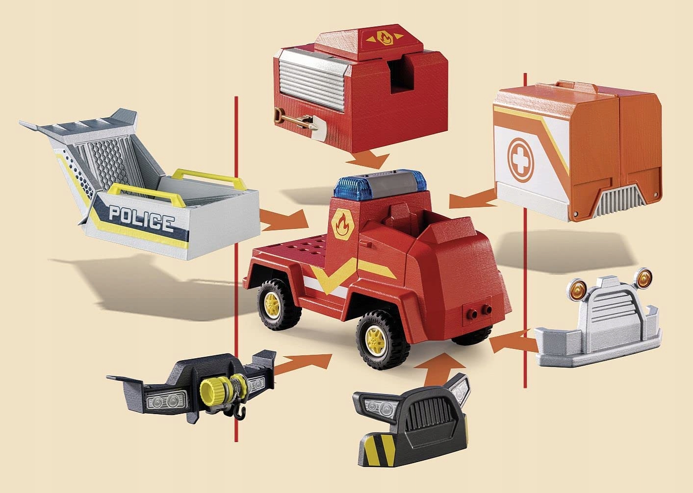 - Akcesoria: 1 wóz strażacki z uchylnym układem kierowniczym oraz modułem świetlno-dźwiękowym, a także pojemnik obrotowy i o regulowanej wysokości, w tym działko strażackie i 2 klapy, 1 płomień, 2 strzały wodne, 1 drabina, 1 gaśnica, 1 łopata.