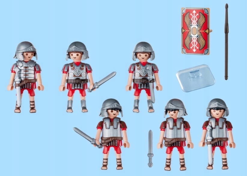 W zestawie: 6 figurek Playmobil: rzymscy legioniści uzbrojenie: hełmy, miecze, włócznie, tarcze podstawki do figurek