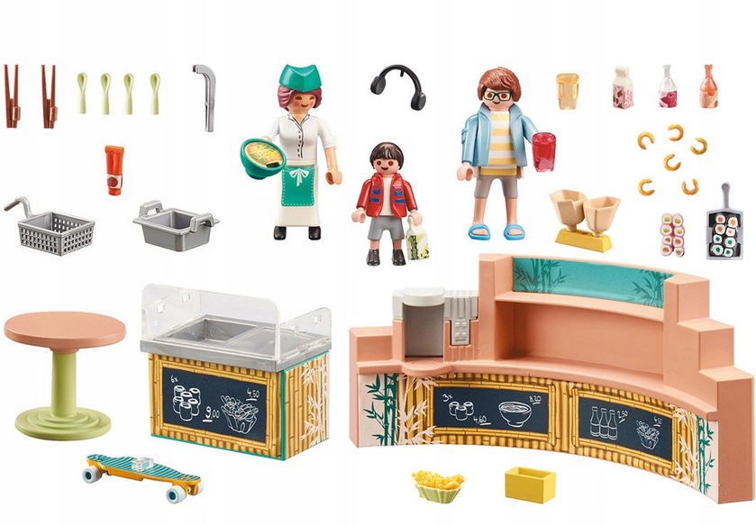 Podczas zakupowego szaleństwa można zgłodnieć. Pora wybrać się do Baru z przekąskami PLAYMOBIL. Sushi, makaron i frytki, a także koktajle są świeżo przygotowane i czekają na spragnionych i głodnych gości.
