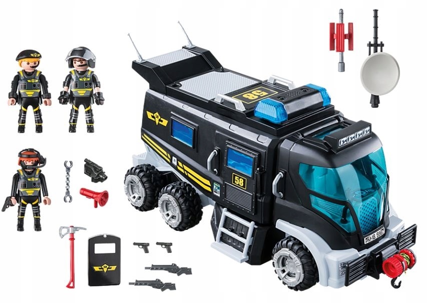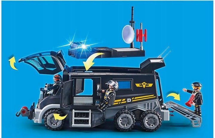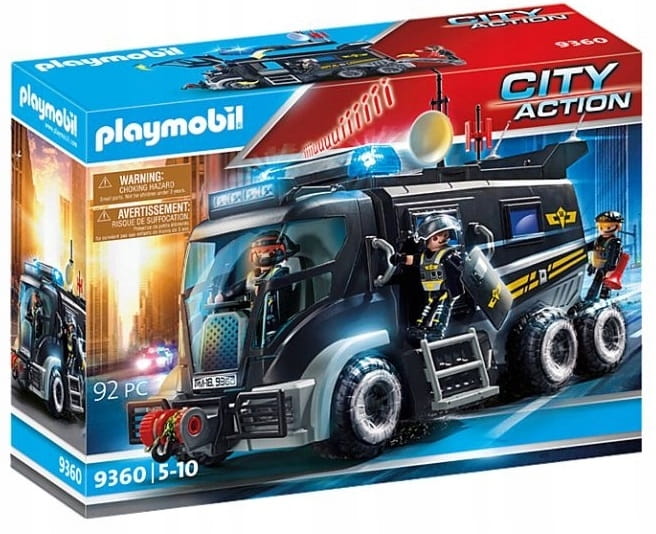 Pojazd jednostki specjalnej ze światłem i dźwiękiem 9360. SWAT to wyspecjalizowana jednostka policji stworzona do przeprowadzania bardzo niebezpiecznych działań. Tworzą ją doskonale wyszkoleni funkcjonariusze, którzy przygotowani są na sytuacje wymagające szybkiej, profesjonalnie przygotowanej akcji. Policjanci wyposażeni są w wyspecjalizowaną broń i ekwipunek, dostosowane do działań, które przeprowadzają.