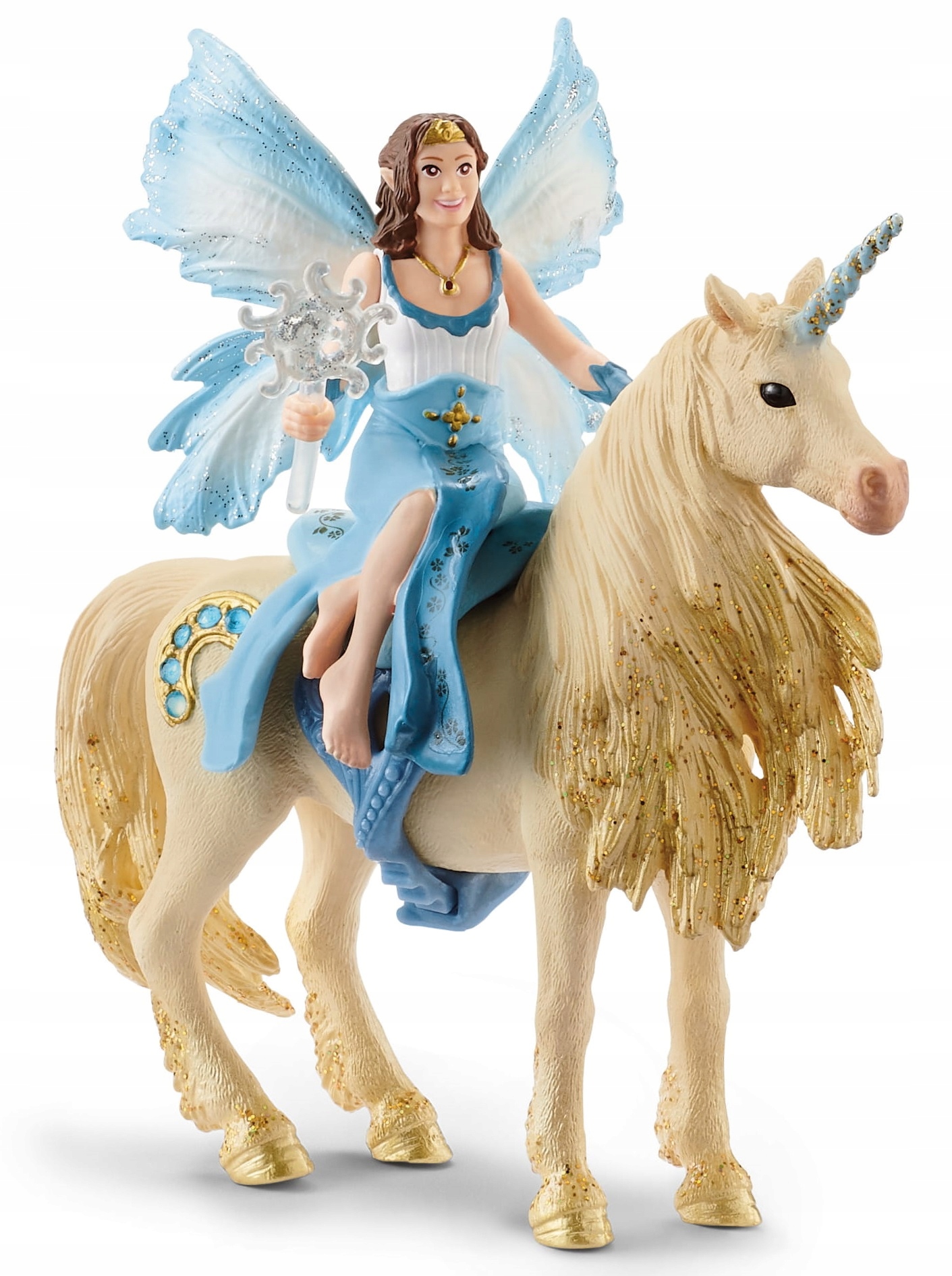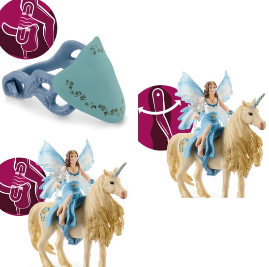 Elfia księżniczka Eleya z pięknym, złotym jednorożcem, to idealny zestaw dla najmłodszych kolekcjonerów figurek Schleich. Całość wykonano z dbałością o szczegóły, dlatego zabawki prezentują się wyjątkowo. Fantastyczny rumak posiada długą grzywę ozdobioną brokatem, niebieski róg oraz cekinową dekorację w kształcie półksiężyca. Jednorożec wyposażony został w jedyne w swoim rodzaju siodło, które umożliwia elficy wygodną jazdę.