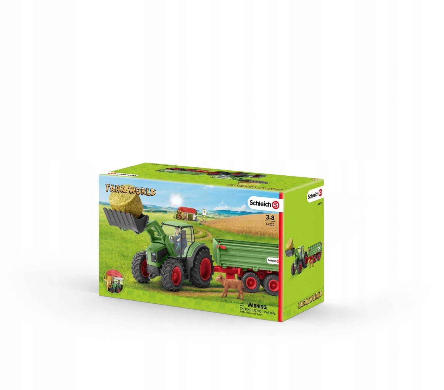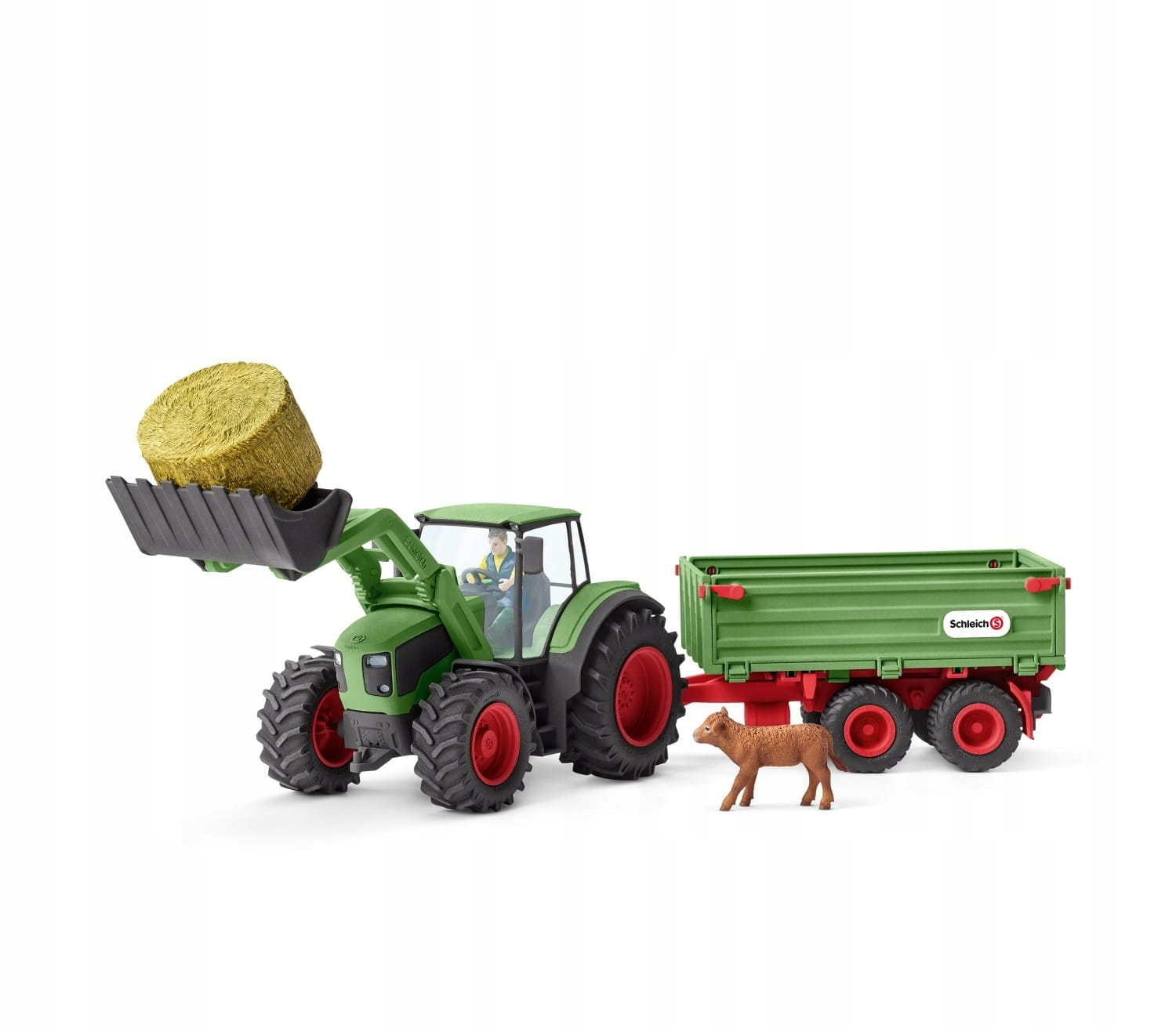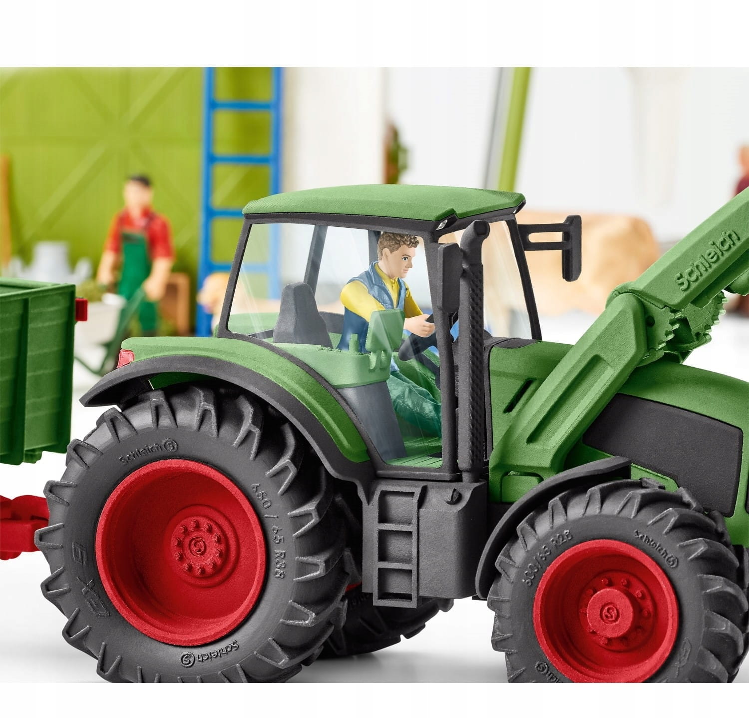 Idealny dodatek do świata gry farmy Schleich®! Ciągnik może przejechać przez bramę farmy (nr kat. 42333), a przyczepa mieści się pod silosem (nr kat. 41429) aby napełnić ją paszą.
