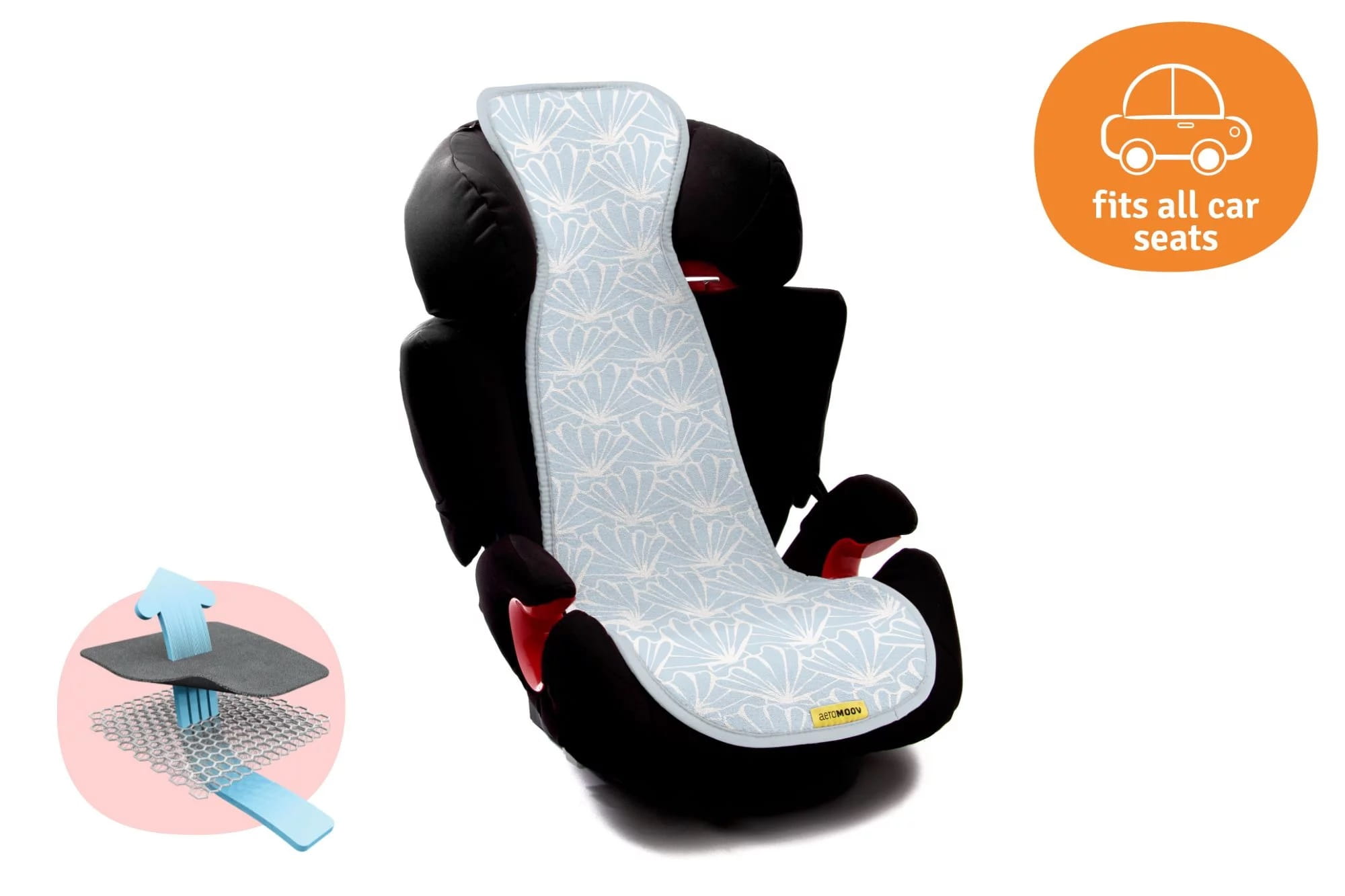 AeroMoov to innowacyjny ochraniacz na fotelik samochodowy zapobiegający nadmiernemu poceniu się dziecka.