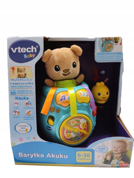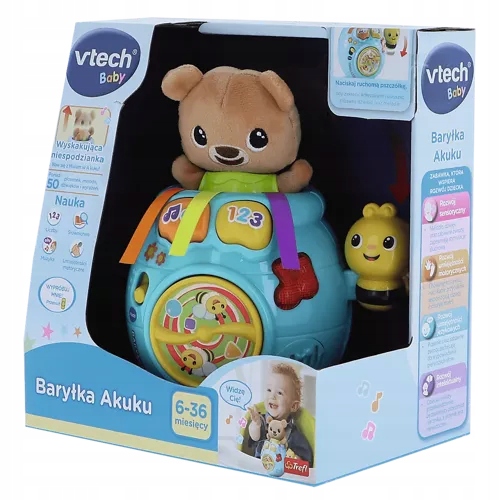 - Poznaj pierwsze słowa z Baryłką Akuku od firmy VTech! Wystarczy nacisnąć jeden z dwóch przycisków na Baryłce, aby rozpocząć wspaniałą zabawę z mięciutkim Misiem.