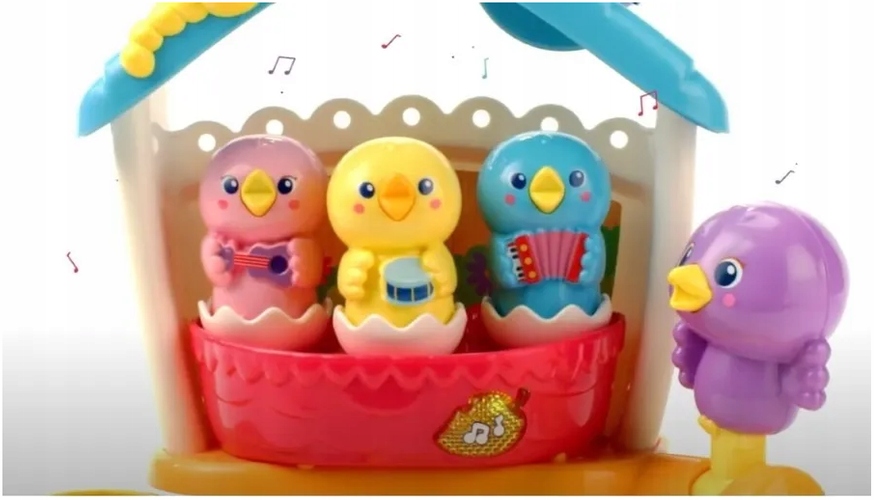 Tuż przy gnieździe znajduje się Magiczny Pieniek, który rozpoznaje ptaszki oraz instrumenty, na których grają. Maluszek może również zagrać na kolorowym pianinku. Naciskając przyciski, uruchomi melodie oraz usłyszy ciekawe zwroty. Rozwój ruchowy wspomaga także żółta gąsieniczka. Przesuwaj ją, aby ćwiczyć rączki! Ptasia Kraina wspomaga rozwój sensoryczny malucha. Różnorodne dźwięki oraz 15 melodii wpływają pozytywnie na rozwój słuchowy dziecka. Zabawka została wykonana z wysokiej jakości materiałów, bezpiecznych dla Twojej pociechy. Posiada opcję regulacji głośności oraz automatycznego wyłączania, która przedłuża żywotność baterii. Zabawka w języku polskim!
