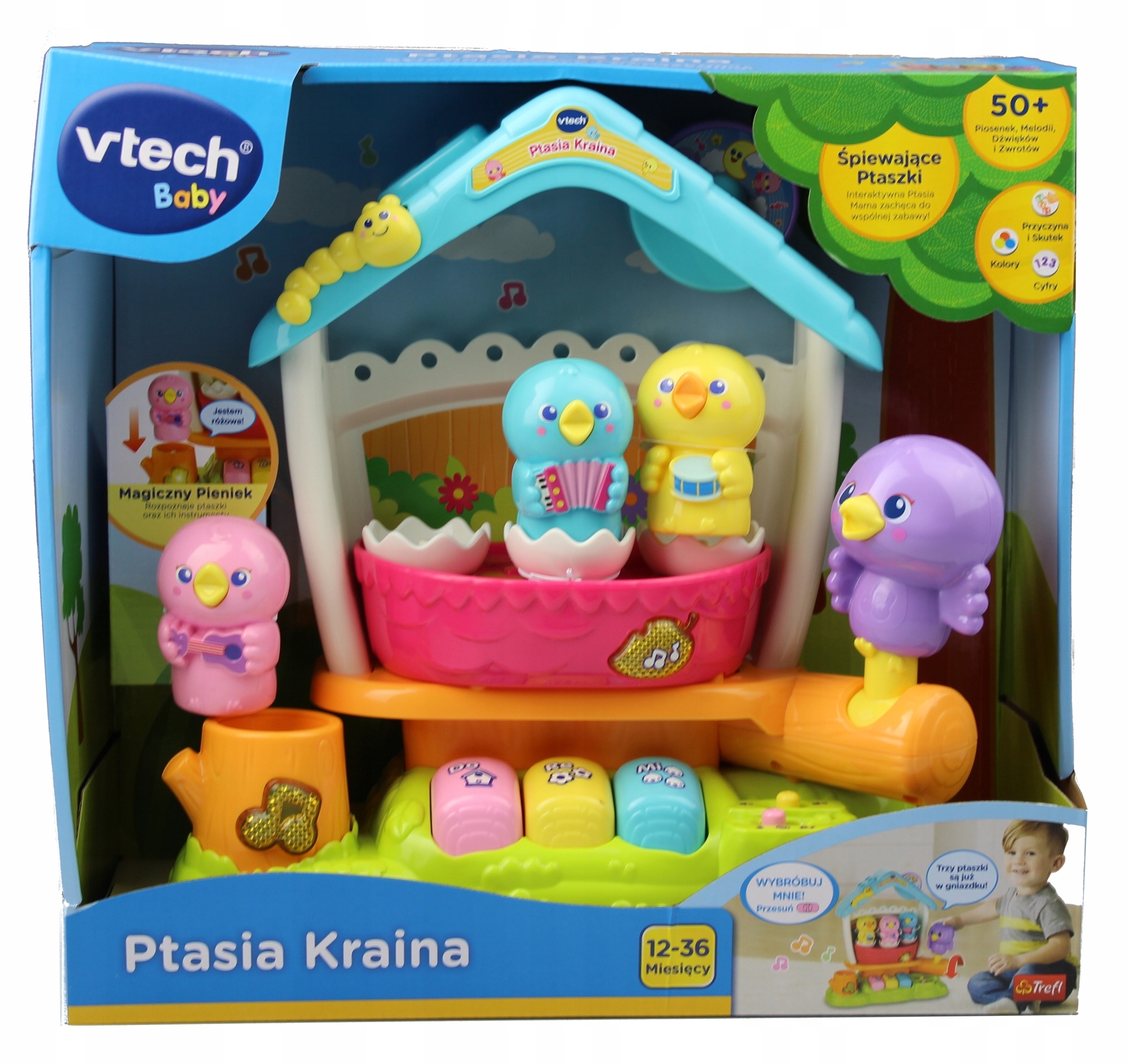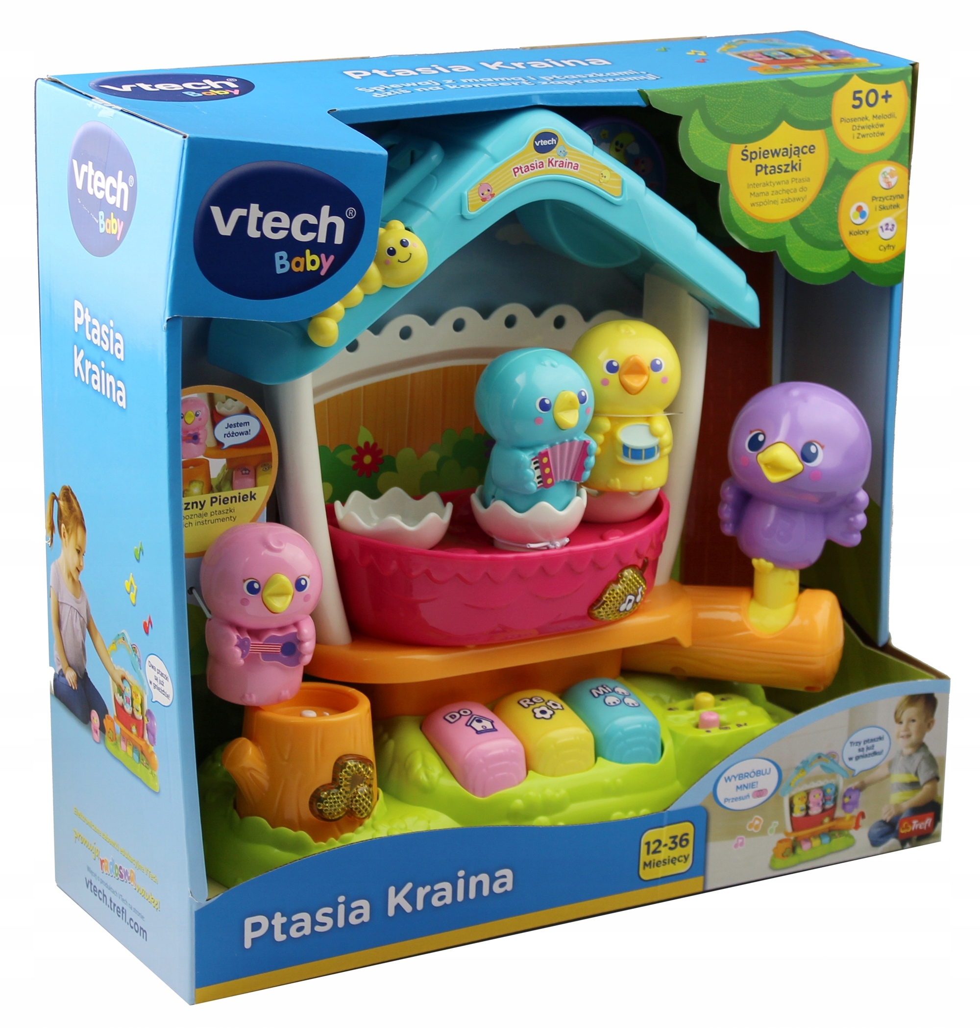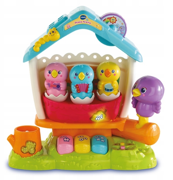 Ptasia Kraina to interaktywna zabawka edukacyjna marki Vtech. Trzy kolorowe ptaszki wraz z Ptasią Mamą nauczą malucha 2 uroczych piosenek oraz cyfr od 1 do 3.