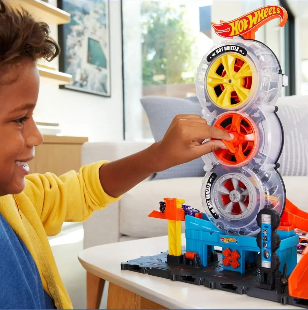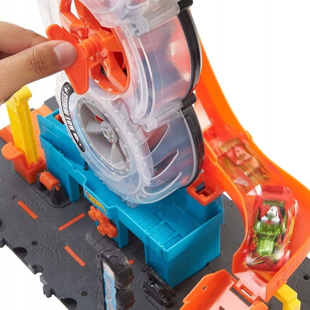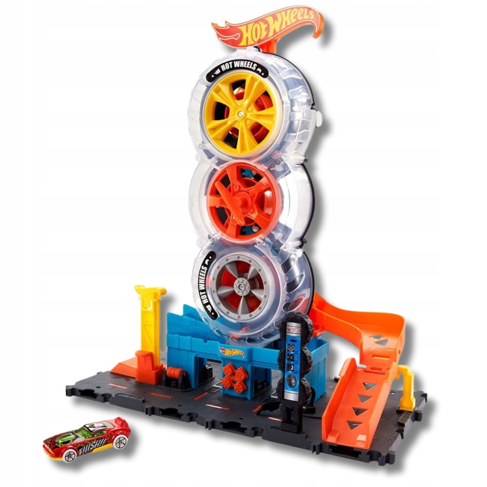 Czas na akcję na wysokich obrotach z zestawem Hot Wheels Wyścigowy Warsztat opon – obracaj klucz na środku i transportuj samochodziki przez półprzezroczyste opony! Gdy dotrą na szczyt, zjeżdżają rampą w dół, po czym wyruszają na nowe przygody. Podstawę zestawu można łączyć z innymi zestawami i torami Hot Wheels, dzięki czemu możesz tworzyć własny świat popisów kaskaderskich i zmagań rajdowych (dodatkowe zestawy i tory sprzedawane oddzielnie). W zestawie jest jeden samochodzik Hot Wheels, ale przez konstrukcję z opon mogą jeździć nawet cztery pojazdy naraz (dodatkowe samochodziki są sprzedawane oddzielnie). Realistyczne szczegóły, takie jak ręcznie aktywowana winda, obrotowy element z oponami i dystrybutor „paliwa”, poszerzają możliwości opowiadania historii. Kolory i elementy dekoracyjne mogą się różnić. · Odkryj nowe, ekscytujące przygody w stylu Hot Wheels z zestawem Hot Wheels Wyścigowy Warsztat opon!